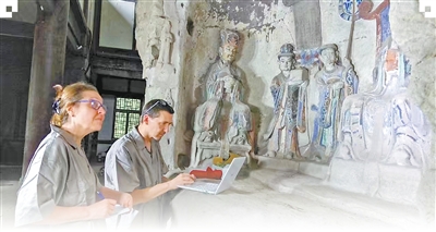 卡洛(右)与米莱拉在大足石刻开展造像病害诊断分析工作。